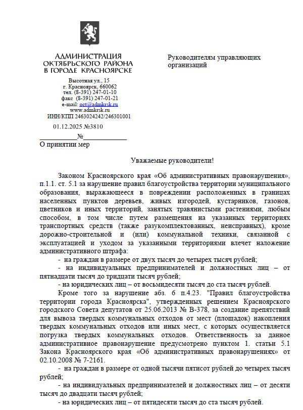 С 16 сентября 2025 года действуют изменения в Правилах благоустройства Красноярска. Теперь в них чётко прописано: нельзя создавать препятствия для вывоза твёрдых коммунальных отходов. За это можно получить штраф.